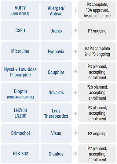 WITH THE LANDSCAPE OF PRESBYOPIA treatments changing, the prospects of topical presbyopia options are growing, and more companies are joining the table.