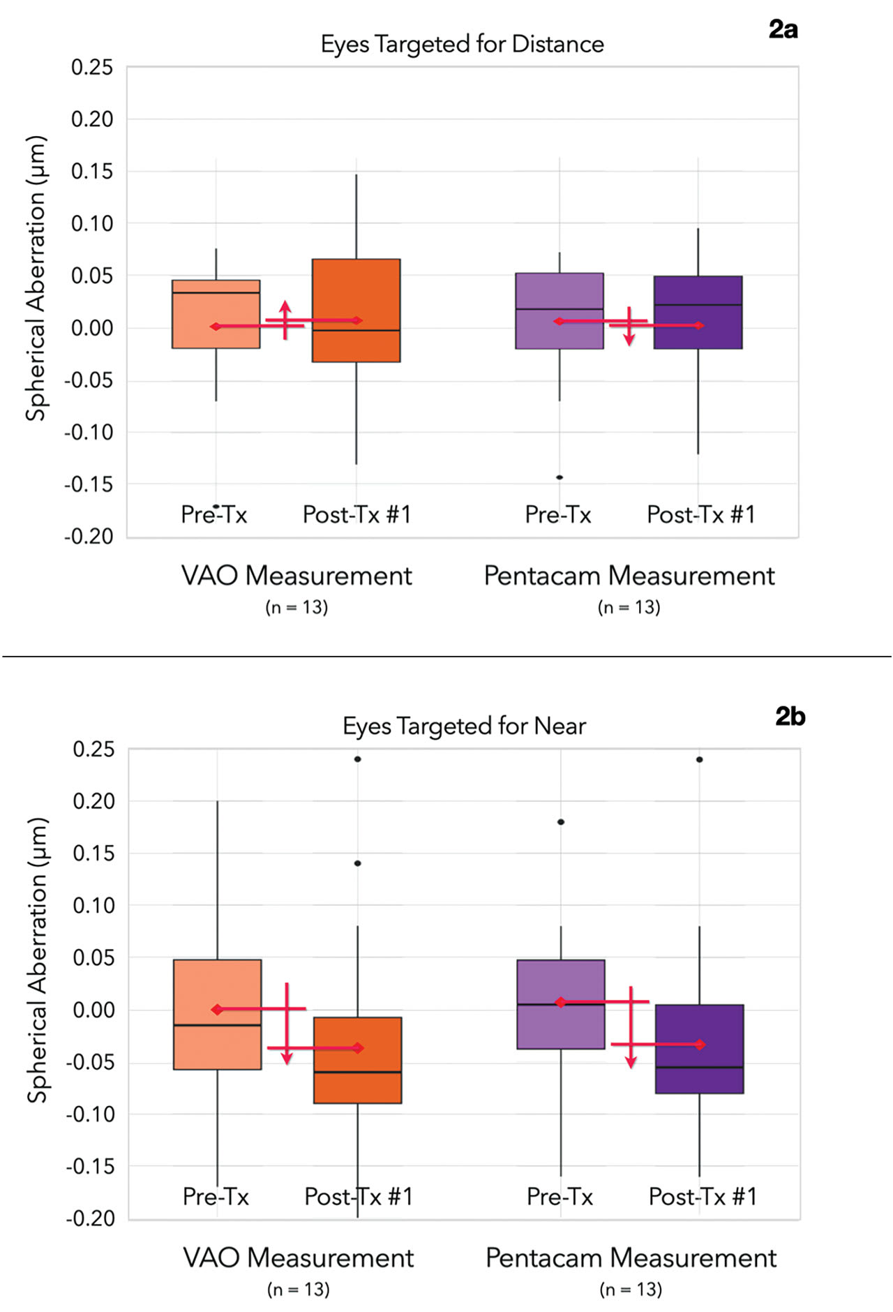 With this point in mind, we decided to examine the changes in SA and its effects on intermediate and near vision following LAL treatment in eyes targeted for uncorrected distance or near vision.5 In this study, we measured SA before and 1 week after the first LDD treatment using both the VAO and the Pentacam AXL-Wave (Oculus). We also measured the changes in monocular, high-contrast distance-corrected intermediateand near visual acuity (DCIVA and DCNVA) using the VAO. We found that the level of (-) SA induced by the first LDD treatment matched the expected level, with no significant changes seen in distance-corrected eyes and a significant increase of approximately -0.05 µm in the near-corrected eyes (Figure 2a and b). In addition, the level of induced (-) SA did not vary with the magnitude of refractive treatment. Slight increases in both DCIVA and DCNVA (0.8 and 0.4 lines, respectively) were seen in near-corrected eyes following LDD treatment compared to distance-corrected eyes. These results also support the potential for (-) SA to increase DOF in near-targeted eyes following LAL implantation and treatment. This DOF extension may permit a reduction in the targeted level of anisometropia in monovision patients, potentially improving binocular distance visual acuity and stereoacuity.
